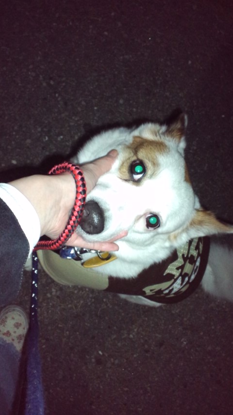 今日のぜろこ 暗闇散歩で暗闇歩道でぜろこ、みてみてぜろこ、こっちむいてぜろこーおいぜろこーみろっつってんだろぉがぁおねがいみてぇこっちむいてぇどんなに言ってもみてくれない子をクイってしましたなんという無表情