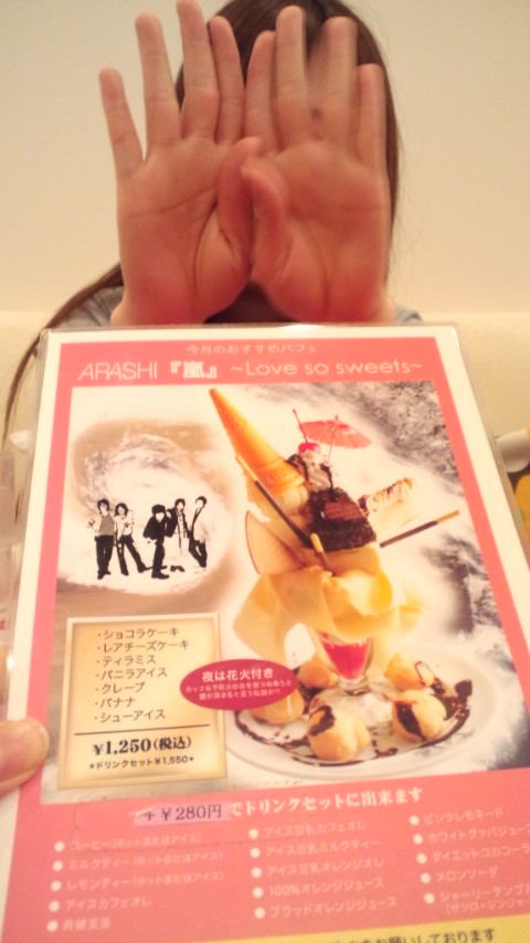 嵐スイーツ く…っ…食べる勇気がでなかっ…けど別のテーブルで嵐スイーツたのんでたひとが…だがこれは…どのへんが嵐なんだろう??緑紫黄青赤のなにかがでてくれば…とおもうが…これはなぜ…そして店に嵐ポスター店が嵐プッシュなのか店員が嵐プッシュなのか嵐がパフェプッシュなのか←萌